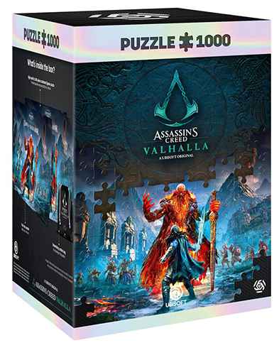 Assassin’s Creed Valhalla Dawn of Ragnarok -palapeli 1000 palaa on pakattu upeaan kuution malliseen palapelilaatikkoon. Mukana tulee palapelin kuvasta pieni posteri ja palat on pakattu kangaspussiin.