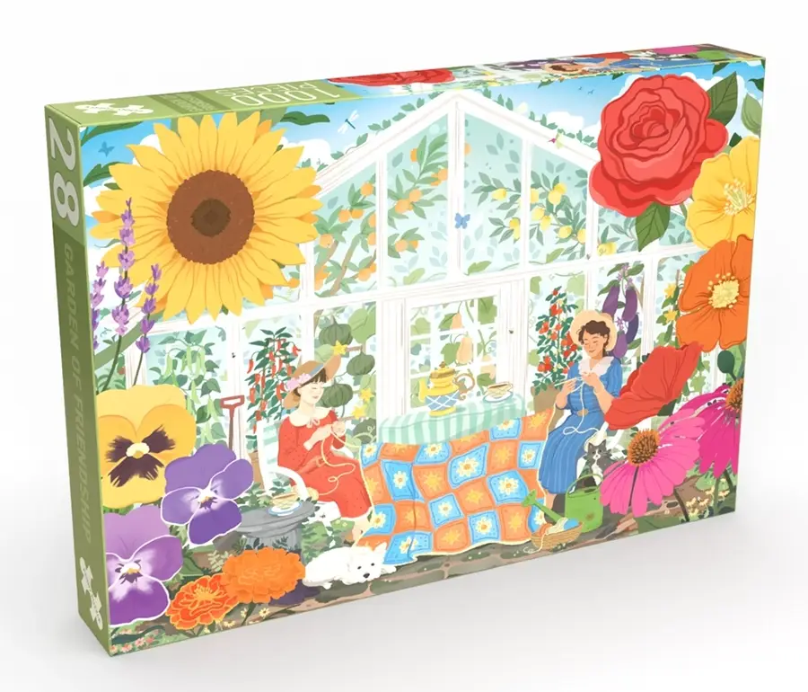 Garden of Friendship on tunnelmallinen 1000 palan palapeli, joka on kunnianosoitus ystävyydelle, yhdessäololle ja kiireettömille hetkille. Kuvassa kaksi ystävää istuu suuren kasvihuoneen edessä, neuloen samaa peittoa vehreän puutarhan ja ylisuurten kukkien ympäröimänä, hetki, jossa aika saa kulkea omaa rauhallista tahtiinsa.