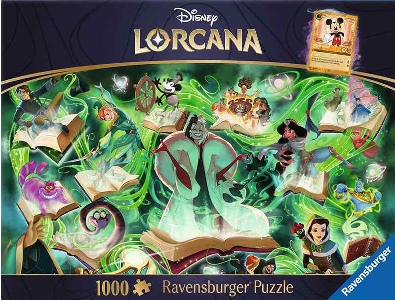 Glimmers of the Realm Emerald palapeli 1000 palaa on Ravensburgerin syksyn 2025 uutuus Disney-palapeli. Kuvat ovat Disney Lorcana Trading Card Game -pelistä.