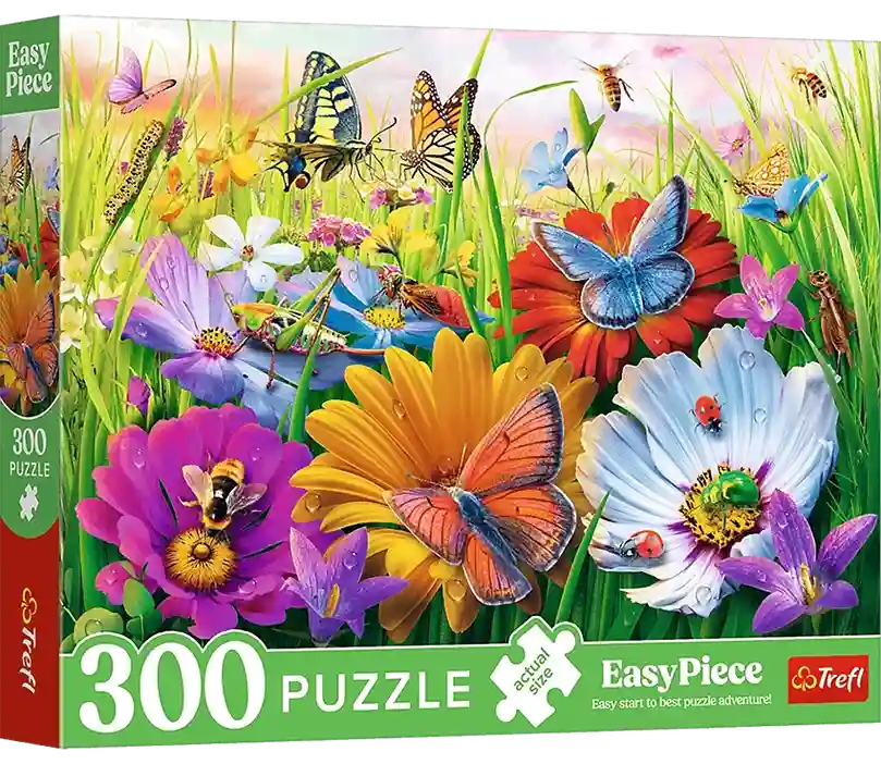 Insects in the Meadow on 300 palan palapeli, jossa niittymaisema täynnä kukkia ja hyönteisiä tekee kokoamisesta rauhoittavaa ja visuaalisesti palkitsevaa. Selkeä värimaailma ja kuvan pienet, tunnistettavat yksityiskohdat auttavat hahmottamaan kokonaisuutta ja tekevät kokoamisesta sujuvaa.