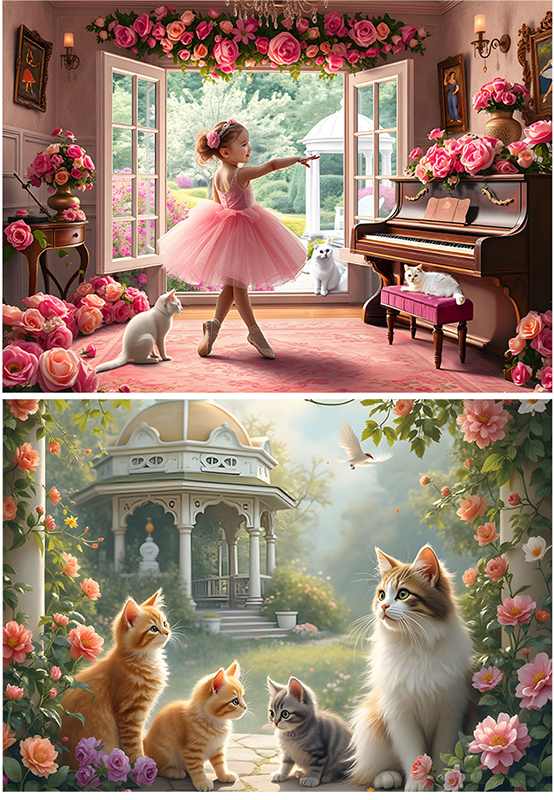 Alipson Petite Ballerine ja Jardin Romantique -palapelit 2×500 palaa on ranskalaisen Alipsonin tuplapakkaus. 500 palan palapeleissä toisessa on pieni ballerina harjoittelemassa ihanassa tyllimekossaan. Toisessa kissat puutarhassa.