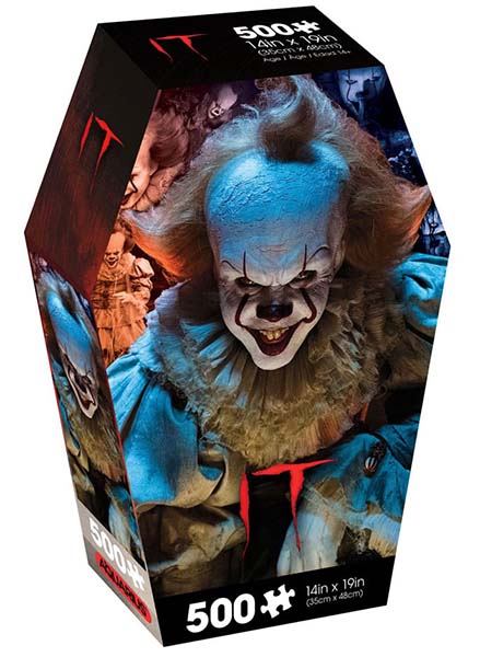 IT Face palapeli 500 palaa on amerikkalaisen Aquariuksen valmistama kauhuaiheinen peli. Kuvassa IT Face Your Fears -elokuvan pahis. Palapelikotelo on ruumisarkun mallinen.