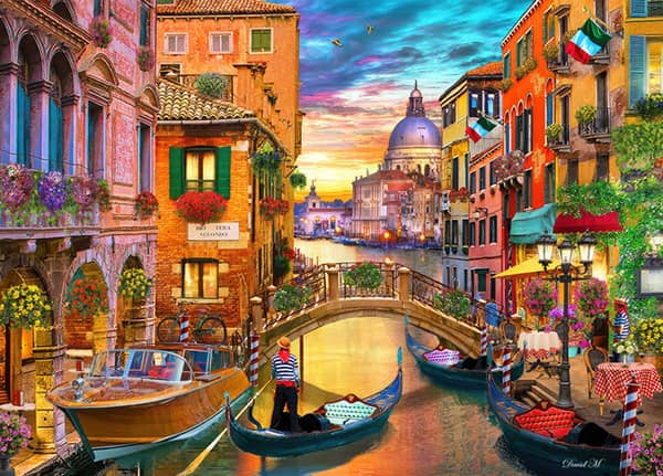Grand Canal Venice palapeli on Bluebirdin 1500-palainen Venetsia-palapeli. Kuvassa laskeva aurinko värjää kanaalin veden keltaisen sävyihin. Värikkäät talot kertovat venetsialaista historiaa. Taustalla näkyy Basilica di San Marco.
