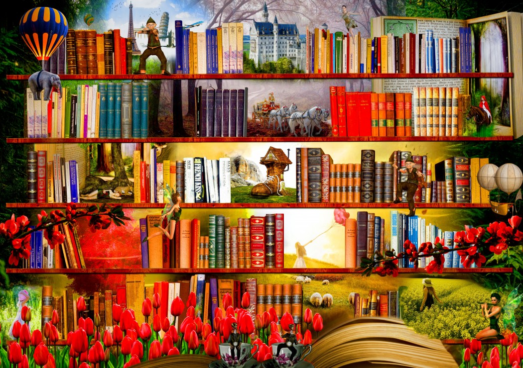 Kirjahylly herää eloon tässä 1500-palaisessa palapelissä. Tarinat vievät omiin maailmoihinsa ja palapelissä on paljon yksityiskohtia.