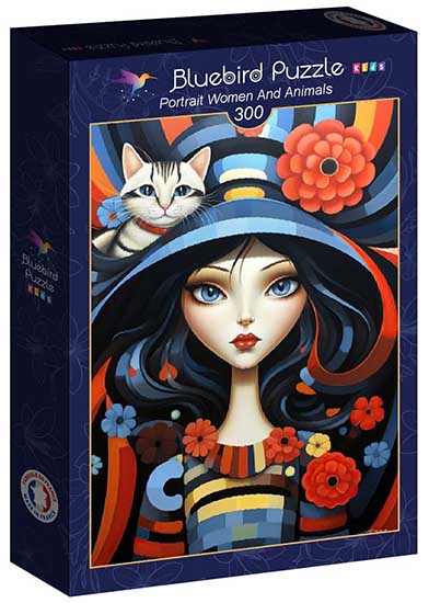 Nainen ja kissa palapeli (Portrait women and animals) on ranskalaisen Bluebirdin 300-palainen. Kuvassa nainen ja kissa ovat asettuneet kuvaan niin, että molemmat katsovat palojen kokoajaan. Kukat, hatun kaareva muoto ja vaatteen kuosi auttavat kokoamisessa. Nainen ja kissa palapeli sopii nuorten lisäksi aikuiselle rentouttavaan hetkeen palapelaamisen parissa.