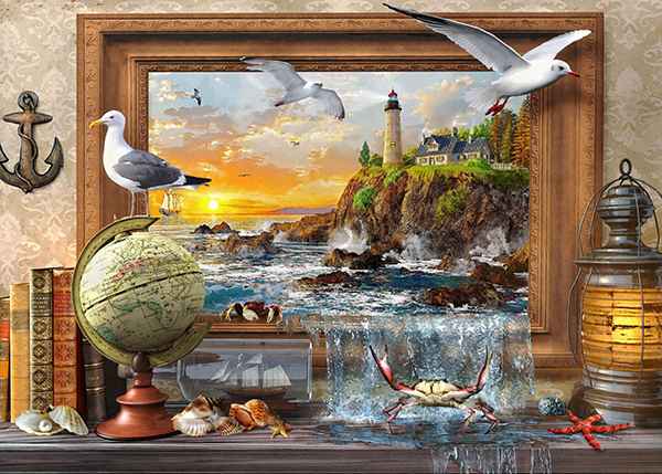 Marine to Life palapeli 500 palaa on Dominic Davisonin kuvittama fantasiakuva, jossa meri valuu taulunkehyksestä olohuoneeseen.