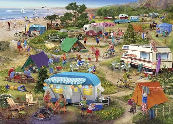 Leirintäalue palapeli (Seaside Cramped Grounds) on ranskalaisen Bluebirdin 500-palainen. Nostalgisessa kuvassa teltat, asuntovaunut ja vanhat autot on sijoiteltu sopivien välimatkojen päähän toisistaan. Leirintäalue palapeli vie kesään, kun hmiset nauttivat oleilusta. Taustalla näkyy rannalla leikkivät lapset ja meri.
