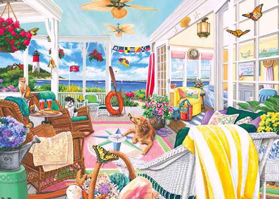 Summer Porch palapeli 500 palaa on ranskalaisen Bluebird Puzzlen kesäinen tunnelmakuva rantamökistä. Keltainen rantapyyhe on heitetty korituolin päälle, ritariperhonen on laskeutunut korin sangan päälle, koirat nauttivat päivästä ja meri näyttäytyy sinisenä.