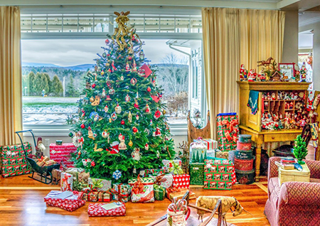 Joulukuusen alla on iso kasa joululahjoja. Joulutunnelmaa täynnä oleva 500 palan palapeli.