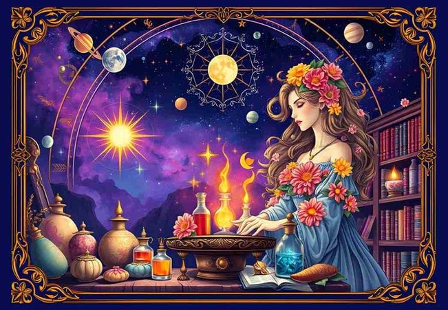 The Alchemist palapeli 1000 palaa on ranskalaisen Bluebird Puzzlen goottityylinen palapeli. Alkemistin pöydällä on erilaisia pulloja ja kirjahylly täynnä kirjoja. Taustalla planeetat piirtyy tummaa tähtitaivasta vasten.