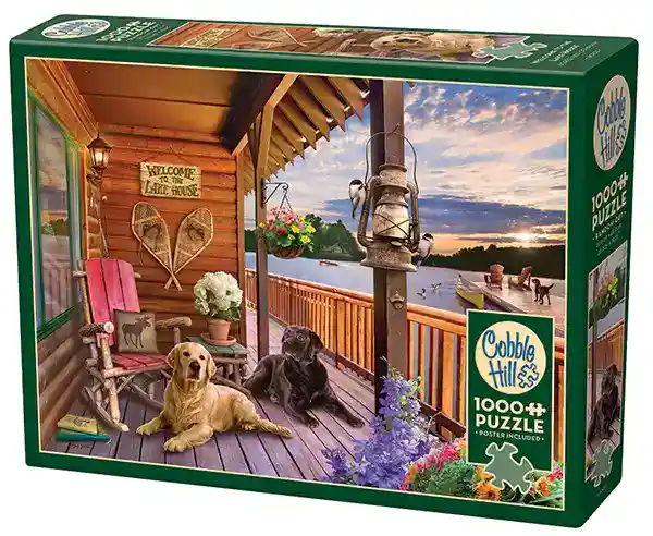 Welcome to the Lake House palapeli 1000 palaa on Greg Giordanon kuvittama mökkiaihe. Kuvassa mökin asukkaan rakkaat ystävät, keltainen ja musta labradorinnoutaja, auringonlasku.