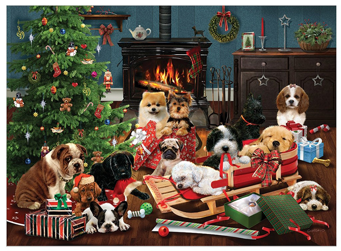 Cobble Hillin Koiranpennut ja joulu. Koiranpennut on 1000 palan palapeli.