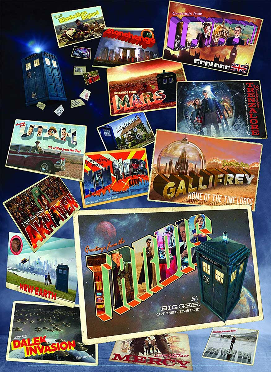Doctor Who -palapeli, jossa Doctor Who -sarjan erilaisia postikortteja. 1000 palan palapeli.
