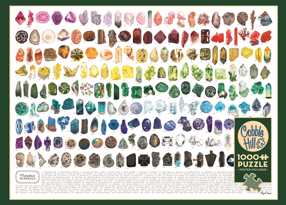 Marvelous Minerals palapeli 1000 palaa on Cobble Hillin mineraalit-aiheinen palapeli. Tässä 1000 palan palapelissä voit opetella jalokivet, mineraalit ja kristallit. Valmiina palapeli on kuin opetustaulu, josta voit tehdä taulun seinälle.
