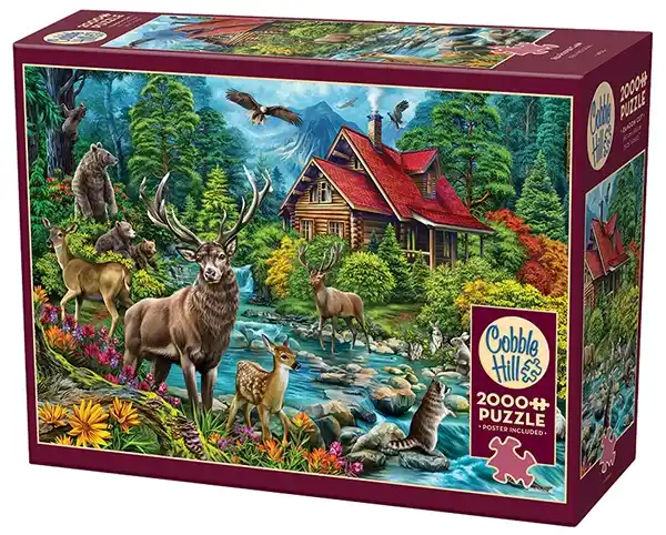 Villieläimet ovat tulleet kuohuvan puron äärelle. Punakattoisessa mökissä joku lämmittää, koska savu tulee piipusta. Tämä 2000 palan palapeli on rohkea värimaailmaltaan ja kaunis koottuna. Rehevät vihreät pensaat ja puut ovat hyvä haaste taivaan sinisen ja turkoosin puron veden ja ruskeiden eläinten kanssa. Nauti palojen tarjoamasta seikkailusta!