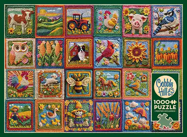Country Life Crochet palapeli 1000 palaa on kanadalaisen Cobble Hillin valmistama. Kollaasikuvassa virkattuja tilkkuja, joiden kuvissa lintuja, possu, pöllö, kukko, lammas, traktori ja muuta luontoon ja maaseutuun liittyviä aiheita.