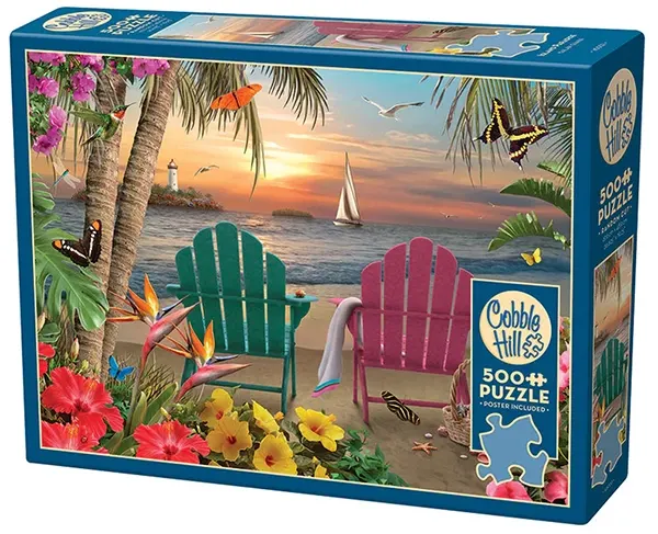 Island Paradise palapeli 500 palaa on kanadalaisen Cobble Hillin valmistama seesteinen maisemapalapeli. Alan Gianan kuvituksessa kaksi rantatuolia on aseteltu niin, että meri ja majakka näkyy. Päivä kääntyy jo iltaan ja taivas värjäytyy oranssin eri sävyihin.
