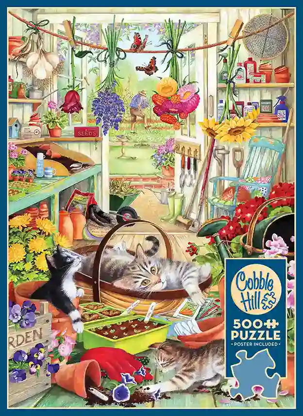 Potting Shed Cats palapeli 500 palaa on Cobble Hillin kissa-aiheinen palapeli. Kissat viettävät aikaa puutarhavajassa kun isäntä puuhaa puutarhassa. Tämä kissapalapeli kissojen, puutarhan, luonnon ja kauniiden palapelien ystävälle.