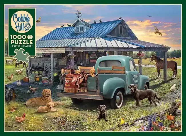 Trading Post palapeli 1000 palaa vie sinut maalle, jossa maalaiskauppa myy ruukuista mattoihin ja muihin aarteisiin. Löydät kaiken tarpeellisen täältä ja jos et ole varma, kysy koirilta – niillä on aina paras vainu, mistä löytää parhaat löydöt.