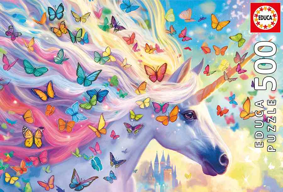 Tämä 500 palan yksisarvinen-palapelin kokoamista helpottaa perhoset, jotka ovat eri kokoisia ja värisiä.