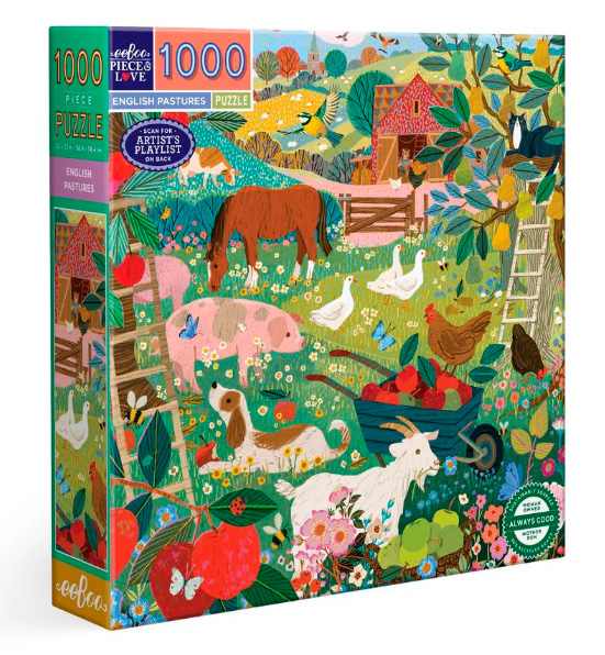 eeBoo English Pastures palapeli 1000 palaa on eläimet laitumella -aiheinen palapeli, jonka on kuvittanut Victoria Ball.