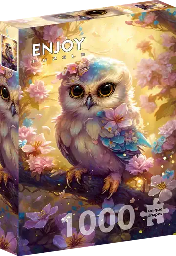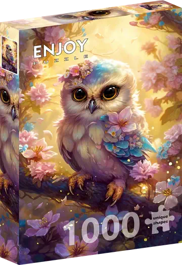 Gentle Owl palapeli on Enjoyn 1000-palainen pöllöpalapeli, jonka kuvassa suloinen pöllön poikanen. Ympärillä kukkii kirsikkapuu, jonka kukat ovat hempeän vaaleanpunaiset.