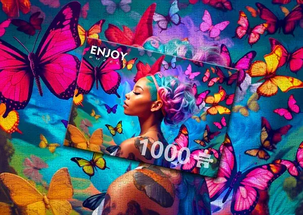 Queen of Butterflies palapeli on Enjoyn 1000-palainen. Kuvassa naisen ympärillä liihottelee värikkäitä perhosia.