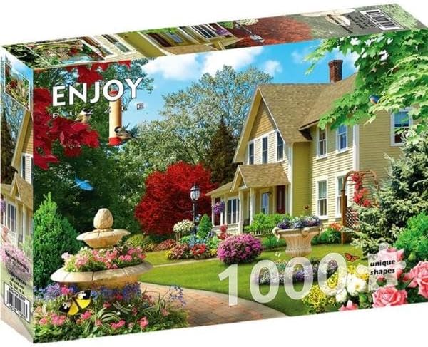 Summer Morning palapeli on Enjoyn 1000-palainen. Kuvassa talon puutarhassa kukkii värikkäät kukat, puut ovat värittyneet vihreän ja punaisen sävyihin.