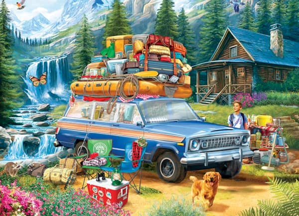 Jeep Loading the Wagoneer palapeli on Eurographicsin 1000-palainen. Kuvassa Jeep on lastattu niin täyteen kesälomaa varten, että Jeepin katollakin on kattoteline kukkuroillaan. Taustalla näkyy lumiset vuoret ja mökki.