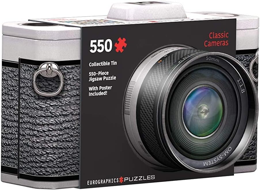Kamera -palapeli peltirasiassa on Eurographicsin 550 palan palapeli. Aidon kameran näköinen pakkaus sisältää tavallisen palapelin, jonka kuvassa on kameroita vuosikymmenten varrelta.