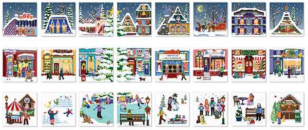 Joulukalenterin jokaisesta luukusta löytyy ihastuttava 50 palan palapeli. Kuvissa ihmiset rakentavat lumiukkoa, vetävät kelkkaa, luistelevat tai vaikkapa rakentavat lumilinnaa. Joissain palapeleissä on kauniita jouluisia rakennuksia.