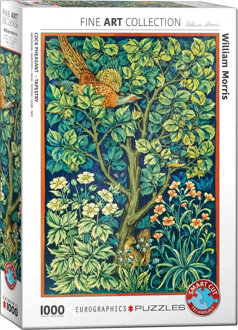 Cock Pheasant palapeli on elegantti 1000 palan palapeli, jossa taide ja luonto kohtaavat. Kuvassa fasaani sulautuu koristeelliseen kasvikuosiin, jossa toistuvat lehdet, kukat ja pehmeät värit. Yksityiskohtainen ja rytmikäs kuvio tekee palapelistä rauhallisen mutta kiinnostavan koota.