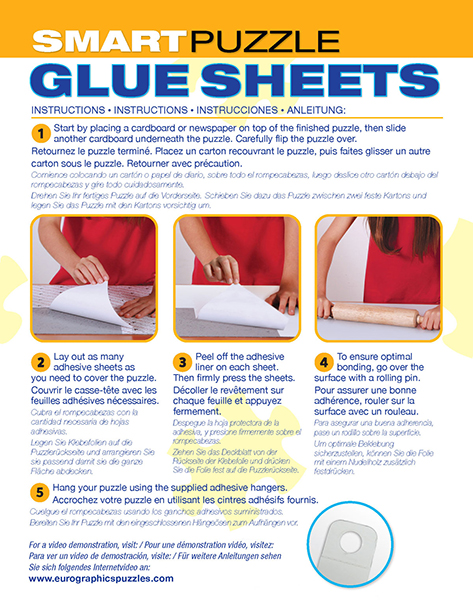 Palapelin liima-arkki Puzzle Glue Sheets on helppo tapa ripustaa valmis palapeli seinälle tai säilyttää kokonaisena. Pakkauksessa 8 kalvoa. Valmistaja kanadalainen Eurographics.