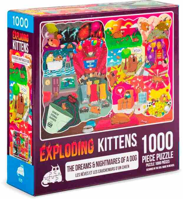 Exploding Kittens palapeli Dreams & Nightmares of Dog kuvaa torkkuvaa Rambo-koiraa. Rambon pään yläpuolella olevat ajatuskuplat näyttävät, miltä hänen päiväunensa näyttävät. Jokainen ajatuskupla kertoo oman pienen tarinansa.