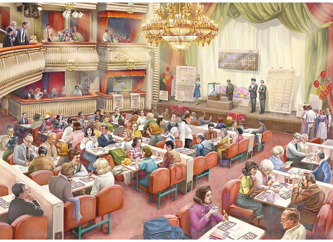 Ihana vanhanaikainen tunnelma bingohallissa. Menneinä vuosikymmeninä bingo oli suosittua ajanvietettä ja bingossa riitti porukkaa.