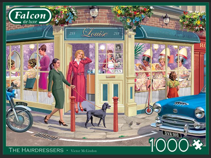 Falcon The Hairdresser -palapeli 1000 palaa on nostalgia-aiheinen palapeli, jonka kuvassa kampaamo ja upeat naiset vintagevaatteissaan. Brittiläinen Falcon de Luxe tunnetaan valmistajan vintagetyylisistä kuvista.