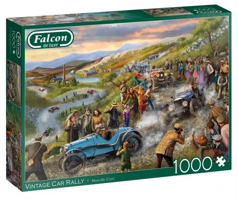 Falcon Vintage Car Rally palapeli 1000 palaa on vintagetyylinen kuva kilpa-ajoista. Autokilpailun on kuvittanut Marcello Corti.