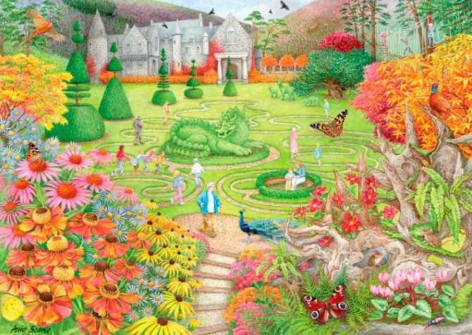 Garden Trails palapeli 1000 palaa on Anne Searlen kuvittama puutarha-aiheinen palapeli. Falcon de Luxe Collection -palapeli. Kasvitieteellisen puutarhan kukkaloistoa täydentää hauskasti kiemurtelevat polut, joita on kiva seurata.