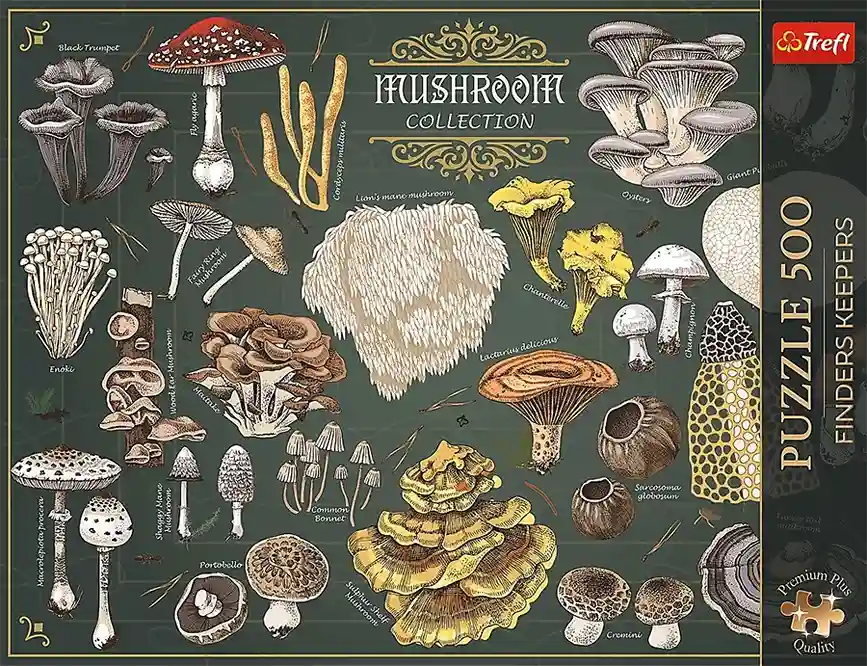 Finders Keepers: Mushrooms palapeli kuuluu Treflin Premium Plus Quality ‑sarjaan ja Finders Keepers ‑kokoelmaan, jossa yhdistyvät havainnollinen kuvitus ja palapelien kokoamisen ilo. Kauniisti kuvitetussa sienipalapelissä esitellään monipuolinen kokoelma sieniä, joiden muodot, värit ja nimet houkuttelevat tutkimaan yksityiskohtia pala palalta.
