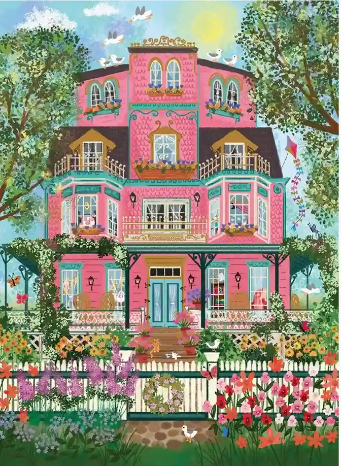 Tämä Galisonin 1000 palan palapeli esittelee hurmaavan roosanvärisen talon, jonka parvekkeilla kukkii värikkäät kukat. Myös puutarhassa kukkii mitä kauneimmat kukat. Ihastu kuvan väreihin ja yksityiskohtiin: