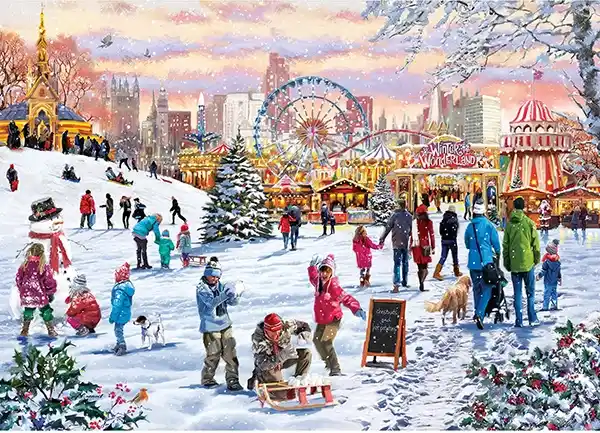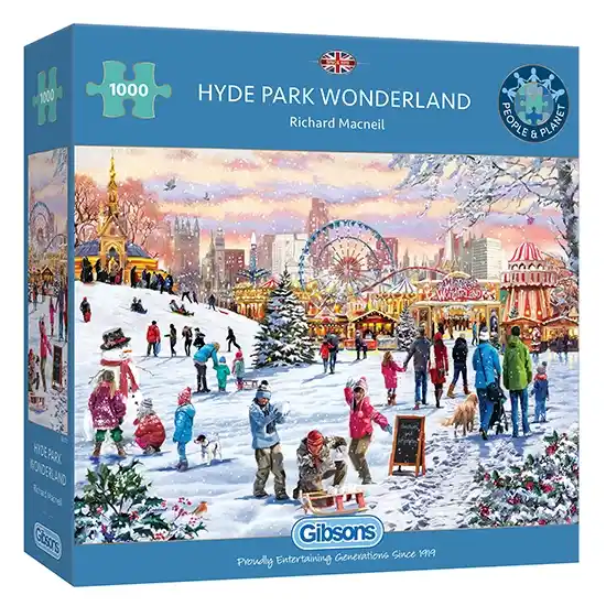 Hyde Park Wonderland palapeli 1000 palaa on brittiläisen Gibsonsin nostalginen kuva lumisesta lontoolaisesta Hyde Park -puistosta. Lapset leikkivät lumessa talvivalojen keskellä. Se on joulun taikaa, joka luo muistoja. Tutustu palapeliä kootessa talven ihmemaahan lontoolaisessa puistossa.