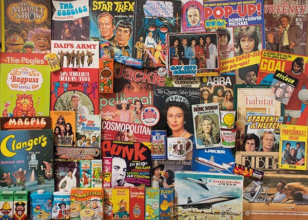 70-luvun tavaroita 1000 palan palapelissä, jonka on kuvittanut Robert Opie.