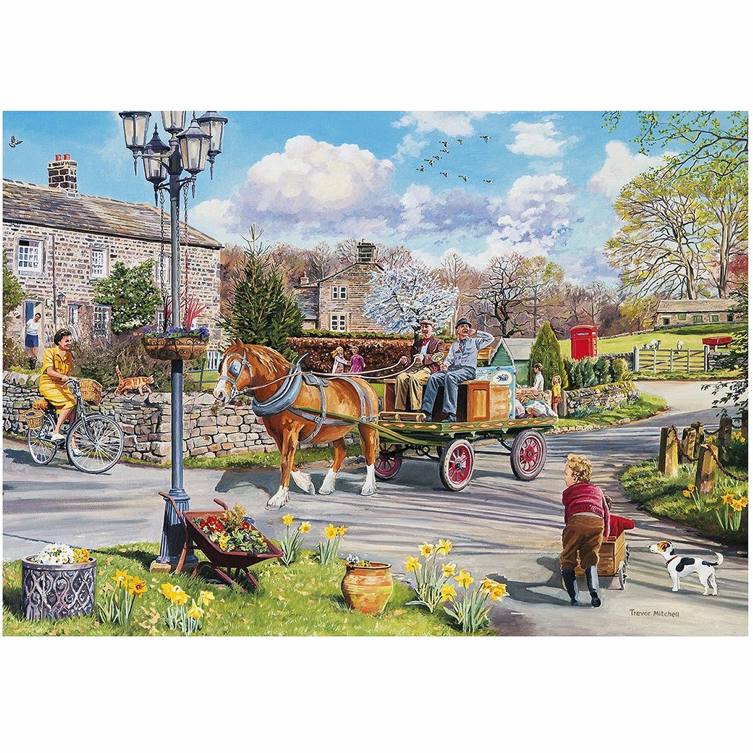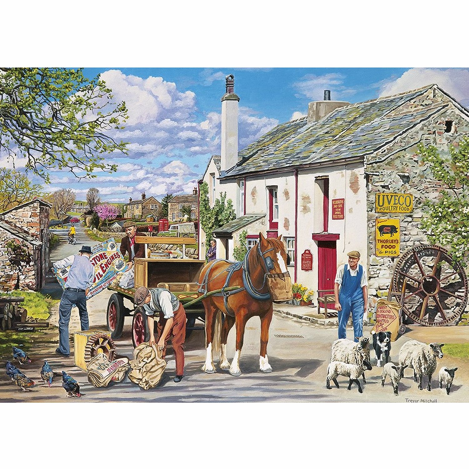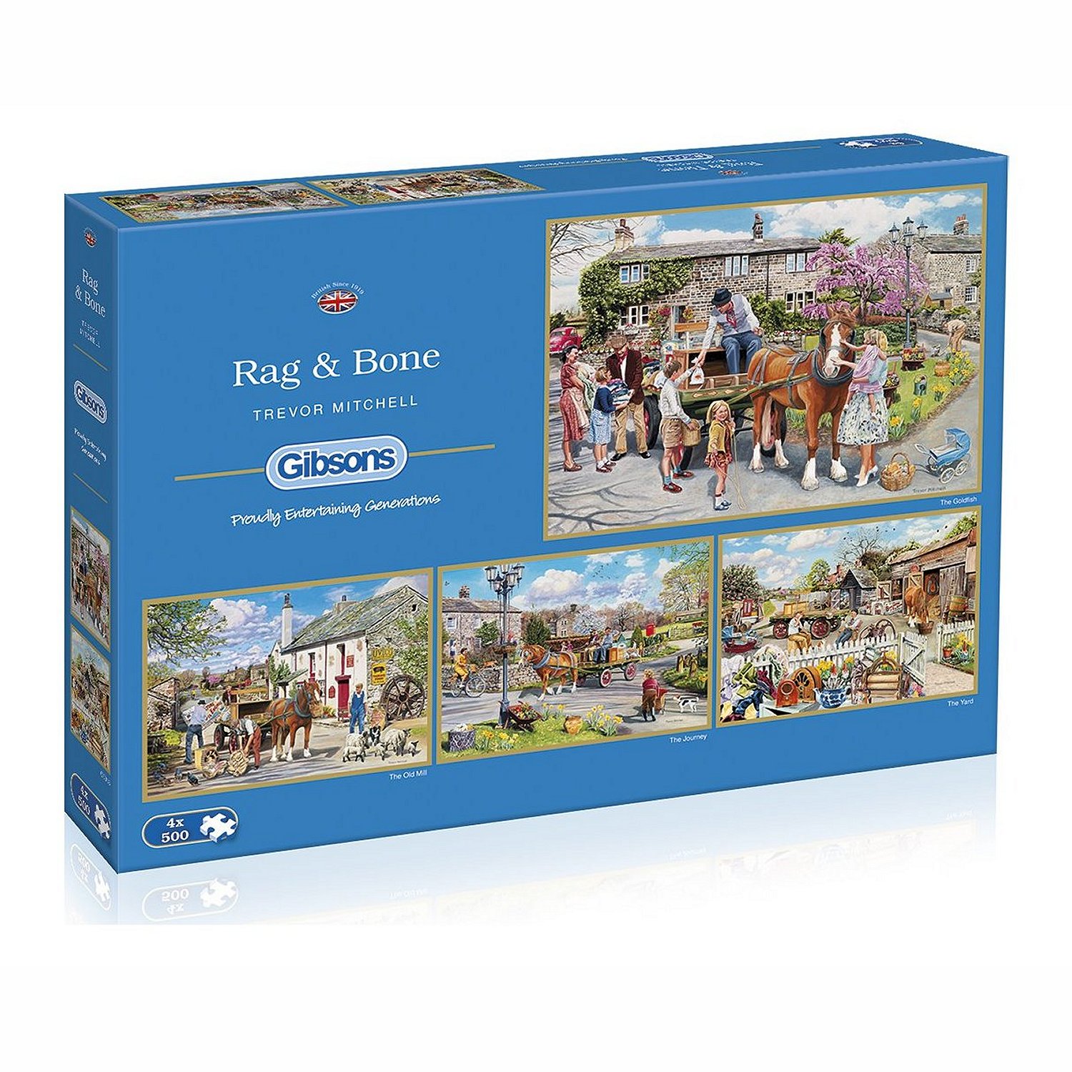 Gibsons Rag & Bone -palapeli. Palapelilaatikossa on neljä erilaista vintagetyylistä palapeliä, joiden kuvissa hevosia, lapsia ja ihmisiä maalaismaisemassa.