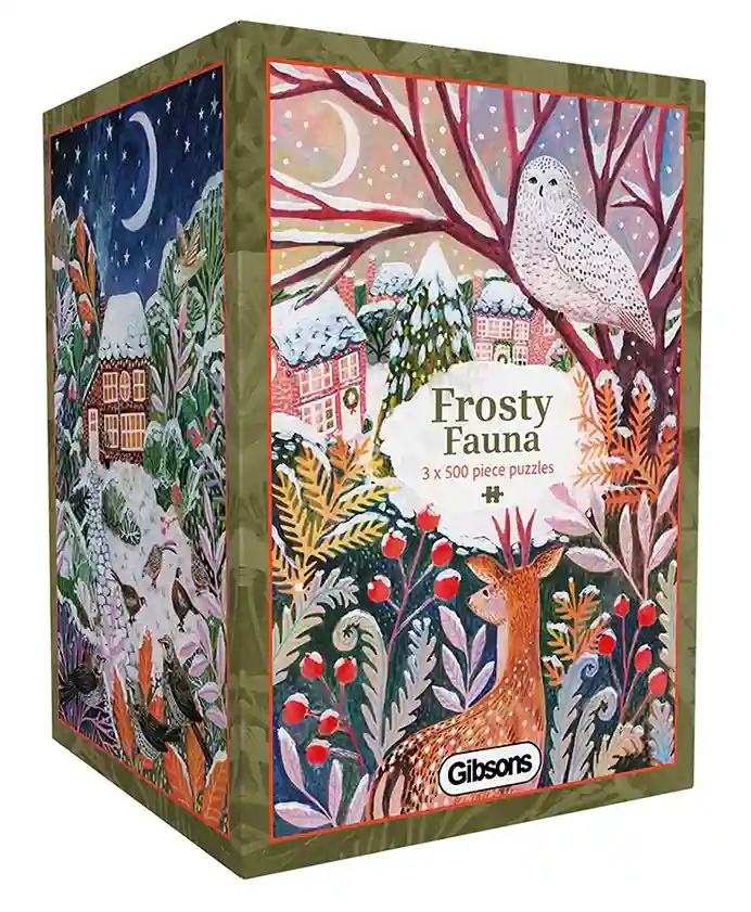 Frosty Fauna palapelit 3×500 palaa on Gibsonsin lintu- ja luontoaiheinen palapelisetti, jonka on kuvittanut Lee Foster Wilson.