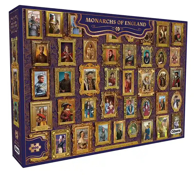 Monarchs of England palapeli 1000 palaa esittelee brittiläisen monarkin ikoneja kuten Henrik VIII:n ja Elisabet II:n. Englannin kruunun historia on pitkä ja tapahtumarikas. Se sisältää 42 Englannin kuningasta ja kuningatarta 1000 vuoden ajalta, Vilhelm I:stä vuonna 1066 aina kuningas Kaarle III:een asti.