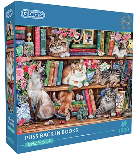 Gibsons Puss Back in Books palapeli 1000 palaa on brittiläisen Gibsonsin kissapalapeli. Kissat touhuavat kirjahyllyssä. Onneksi maljakko on pysynyt pystyssä.