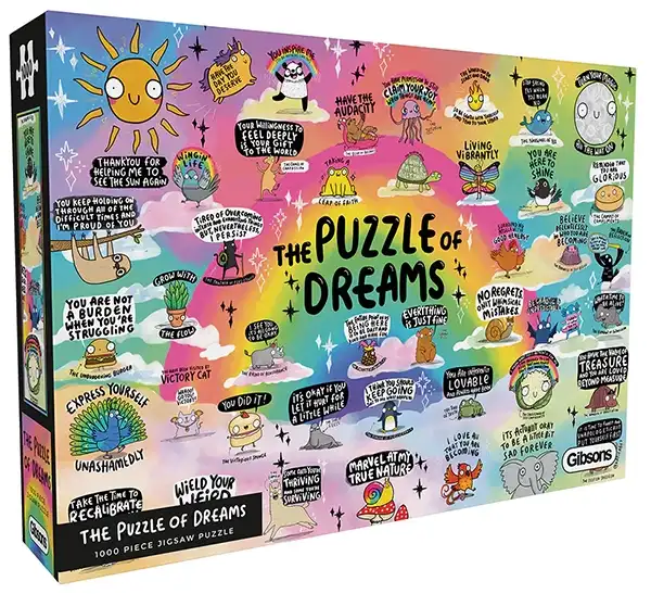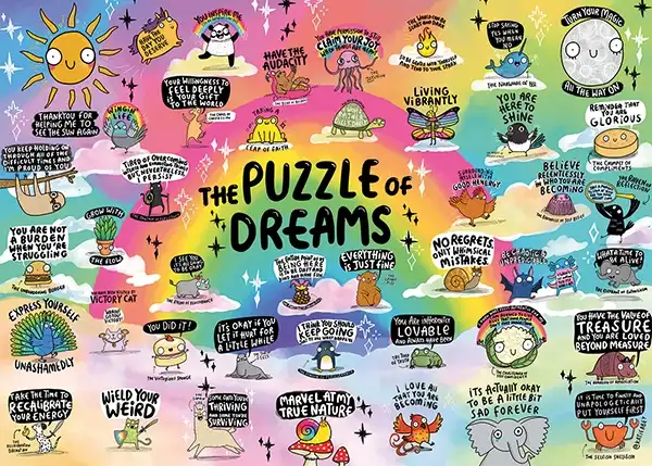 Gibsons The Puzzle of Dreams palapeli 1000 palaa on brittiläisen Gibsonsin positiivisuus-palapeli. Taiteilija Katie Abey haluaa tuoda kuvituksellaan hymyn huulillesi ja tuoda esille jokaisen yksilöllisyyden. Olen juuri hyvä sellaisena kuin olet.
