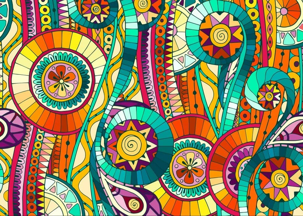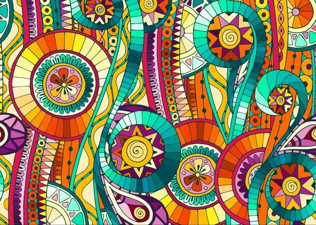 Tässä graafisessa palapelin kuvassa kukat, nauhat ja ornamentit leikittelevät pyöreinä muotoina ja värien riemuna