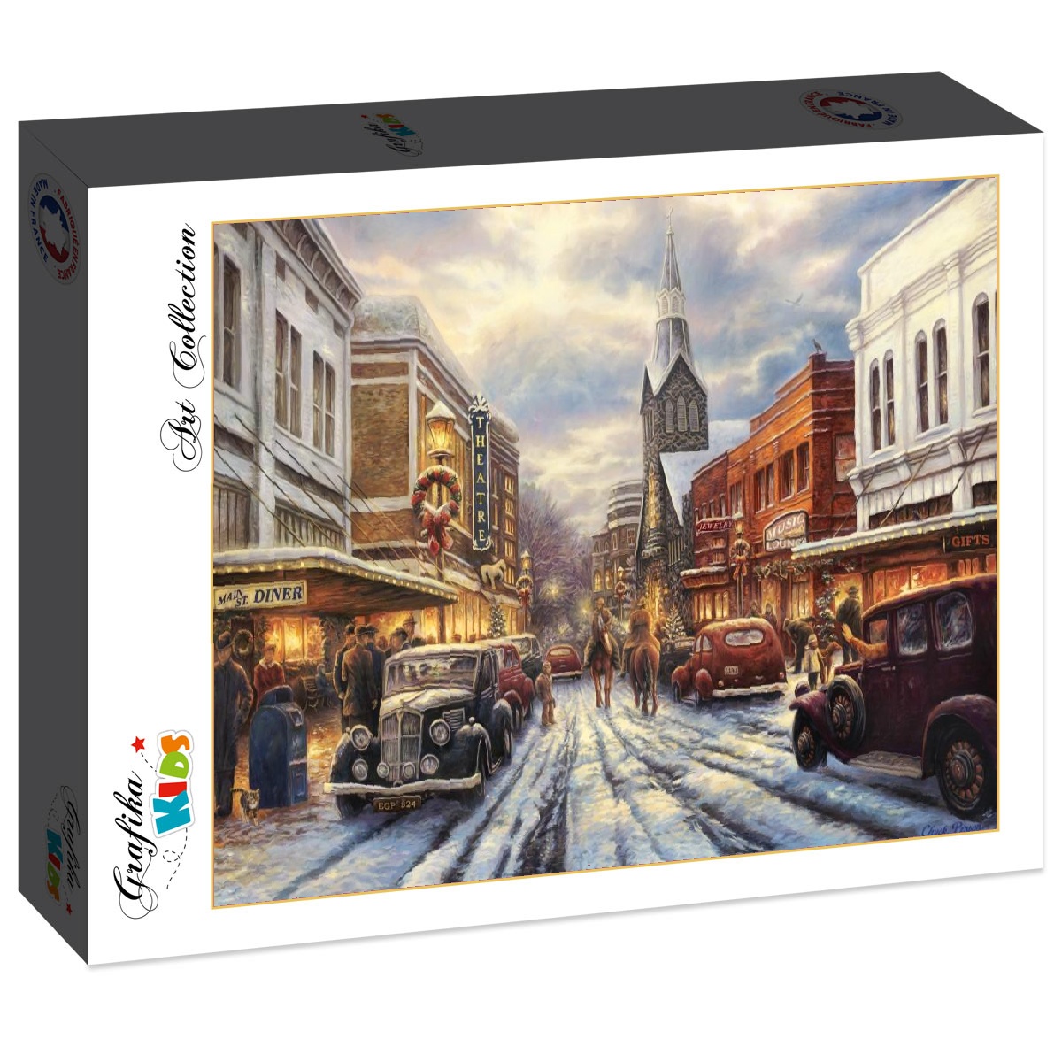 Chuck Pinsonin kuvittama Pienen kaupungin elämää -palapelissä palataan vuosikymmenien takaiseen maisemaan. Vanhat autot ja hevoset kuuluvat talviseen katukuvaan.