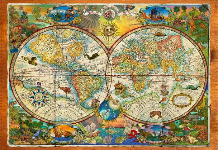 Creatures of the Earth Map palapeli 1000 palaa on Garry Waltonin kuvittama karttapalapeili. Vanha maailmankartta on kuvitettu kartan lisäksi erilaisilla eläinten kuvilla. Uppoudu vanhaa maailmaan tämän Garry Waltonin kuvittaman kartan parissa.
